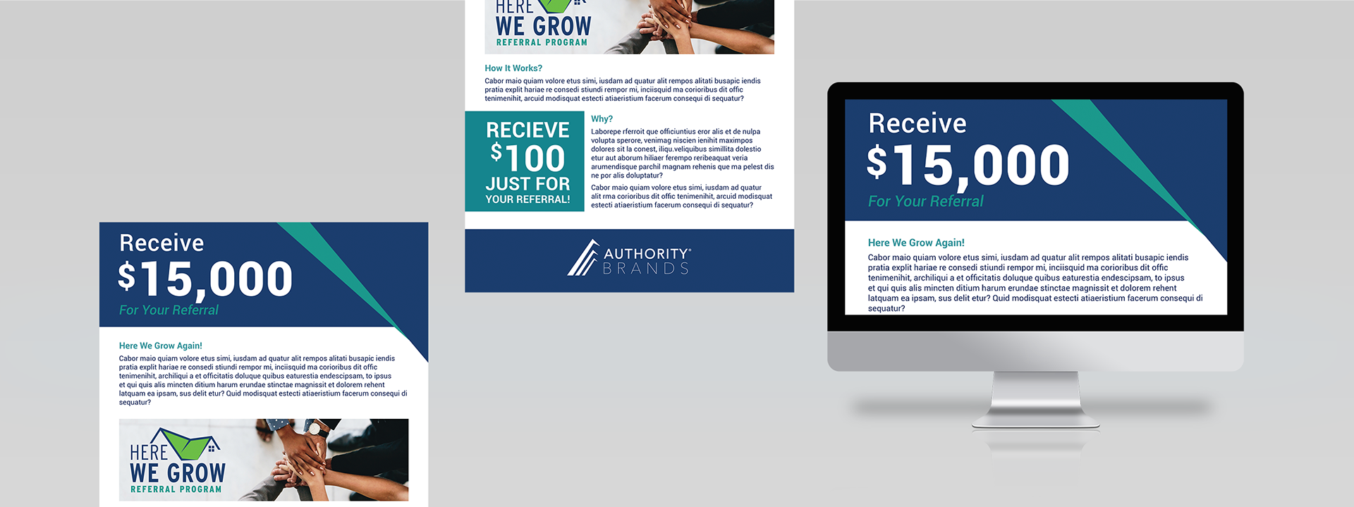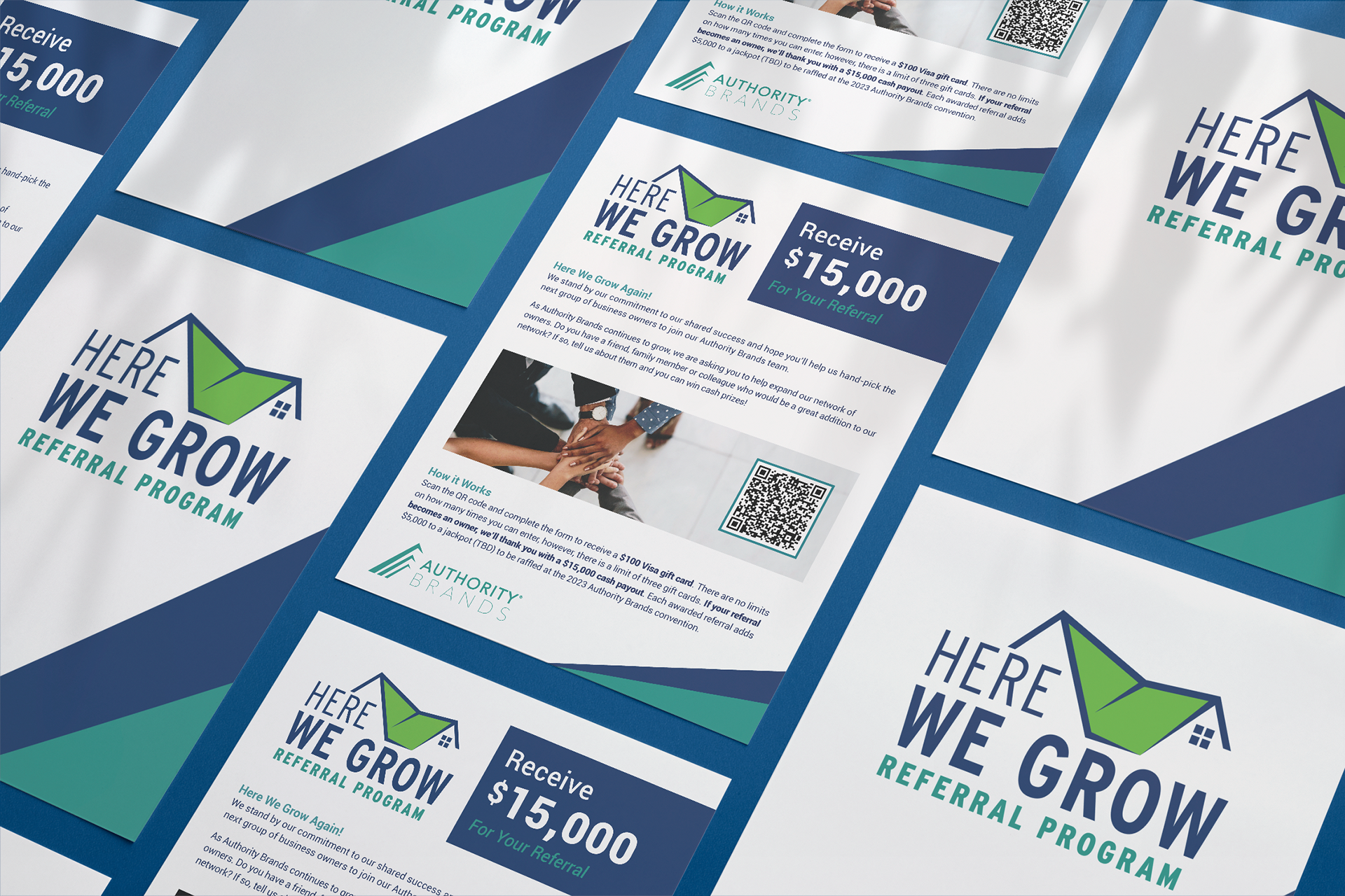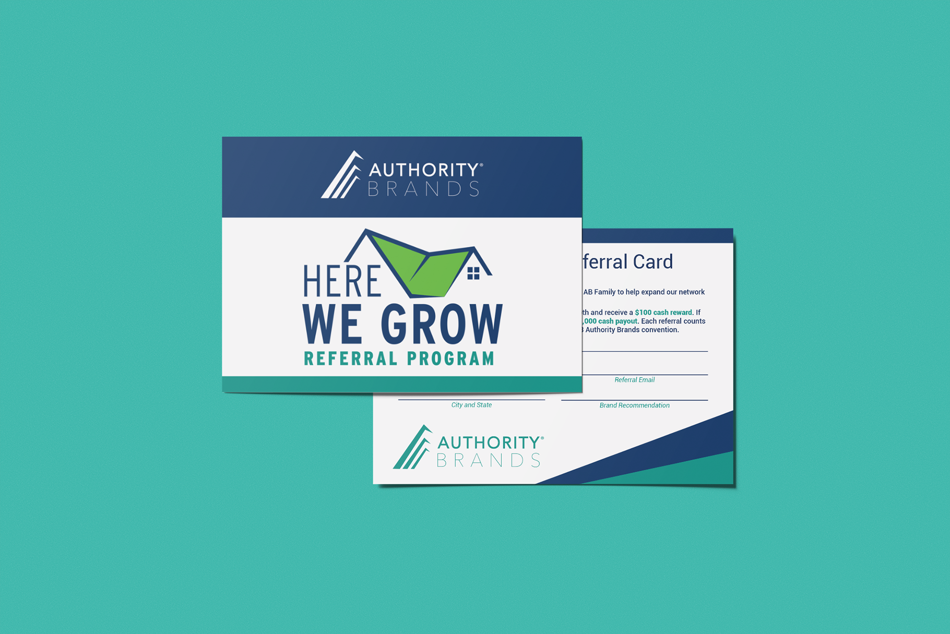 Designed the logo for a referral program that also follows the brand standards for Authority Brands, an industry-leading home service franchise network. Additionally created collateral with the logo to promote this program.